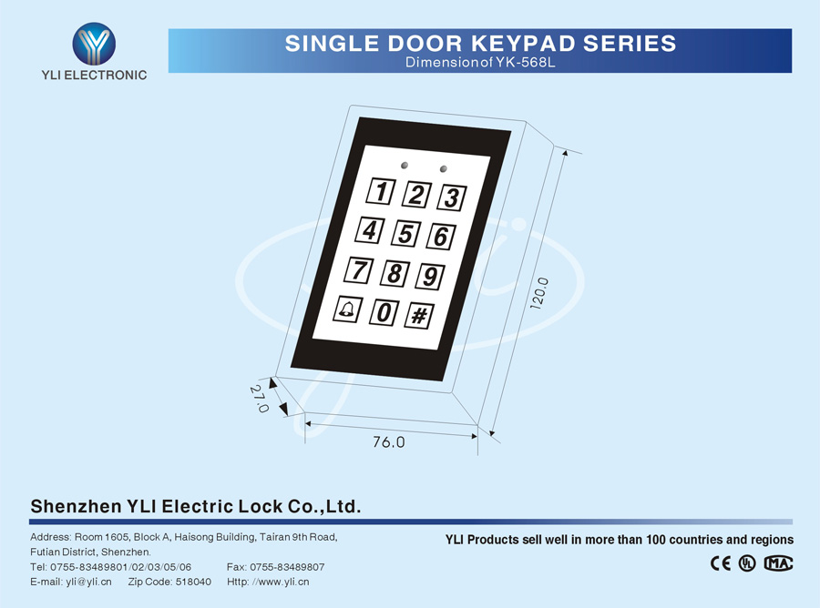 YK-568 is a type of numeric access control keypad that supports touch-less card reading,supporting up to 500 users,suitable for out door installation,it adopts most advanced micro processor and Large-capacity memory chip,all settings can be saved in case of power failure,keypad is also easy to operate and programming,its a perfect choice as access control device for many environments like office,residences,workshops etc.