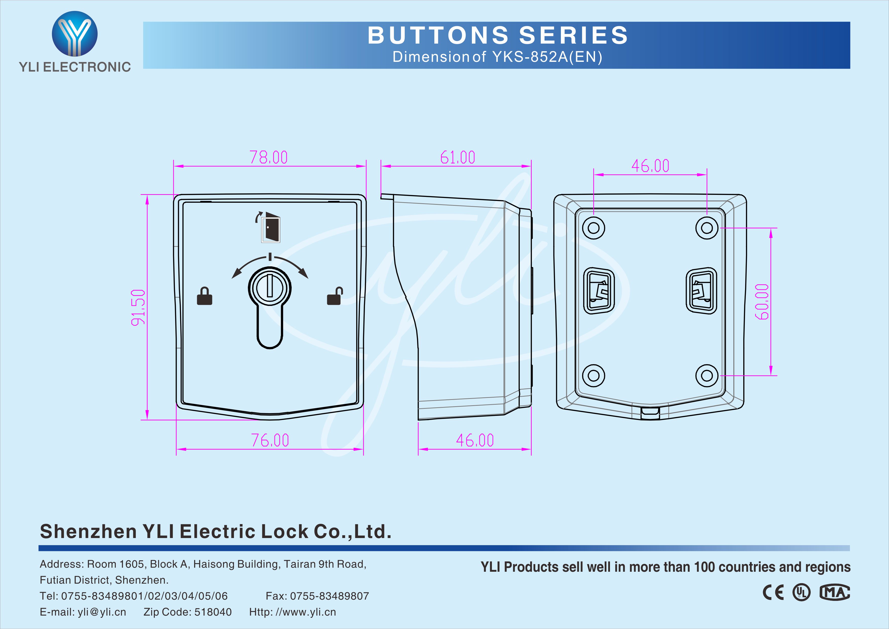 YKS-852B(EN) is an European Standard Waterproof Exit Button with Key Switch in size of 78Lx91.5Wx61H(mm). They are often used in public authorities, banks, large、small and medium-sized enterprises, department stores and residences.
