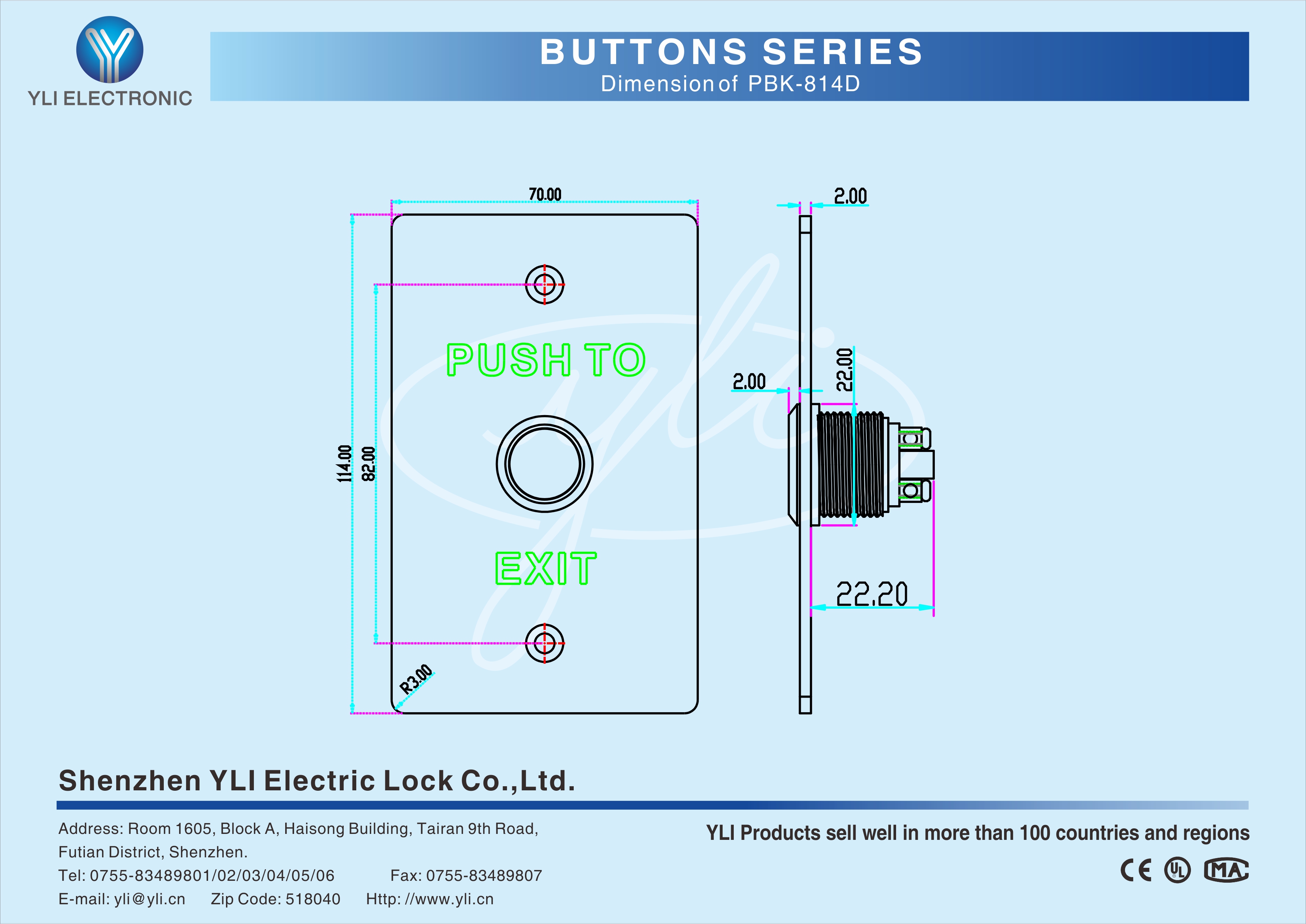 PBK-814D is a stainless steel door release button with size of 114Lx70Wx31H(mm), American standard,which is the most common and the most frequently used in the access control systems.