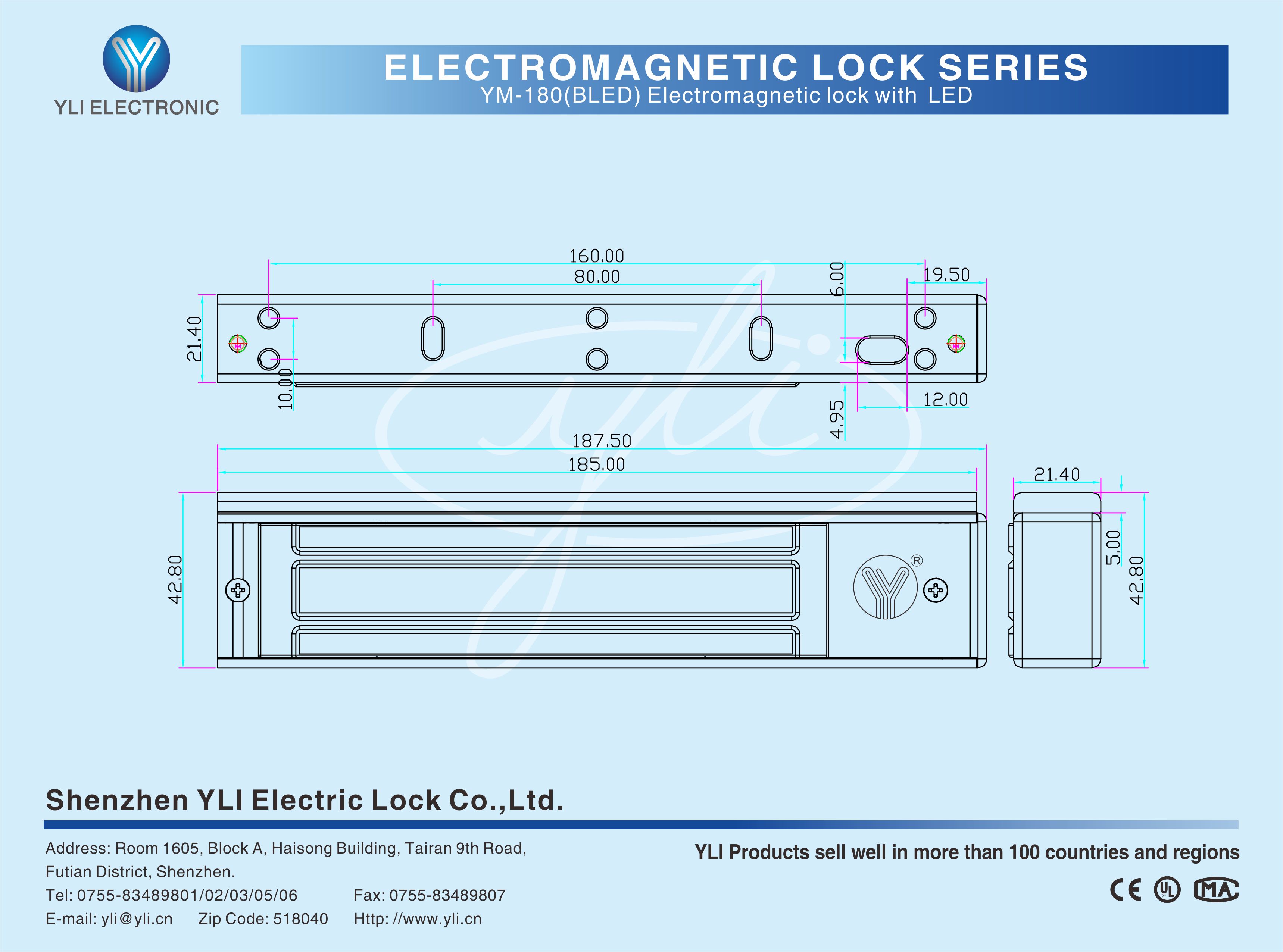 YM-180(BLED) Single door magnetic lock is designed for wooden door, metal door, glass door and fireproof door. There is a set of lock status signal (NO/NC/COM) output contacts. The lock body is equipped with a large LED light. The green light indicates unlocking, and the red light indicates locking. YLl magnetic lock cores are produced with robotic laser welding technology, providing 2 to 3 times stronger impact resistance and torsional resistance than conventional production processes. The surface is treated with the internationally leading electroplating process and the lock itself has passed the 240-hour salt spray test in the national laboratory, achieving excellent performance of anti-oxidation, anti-rust and anti-corrosion. Our company offers a complete range of brackets for different locks.